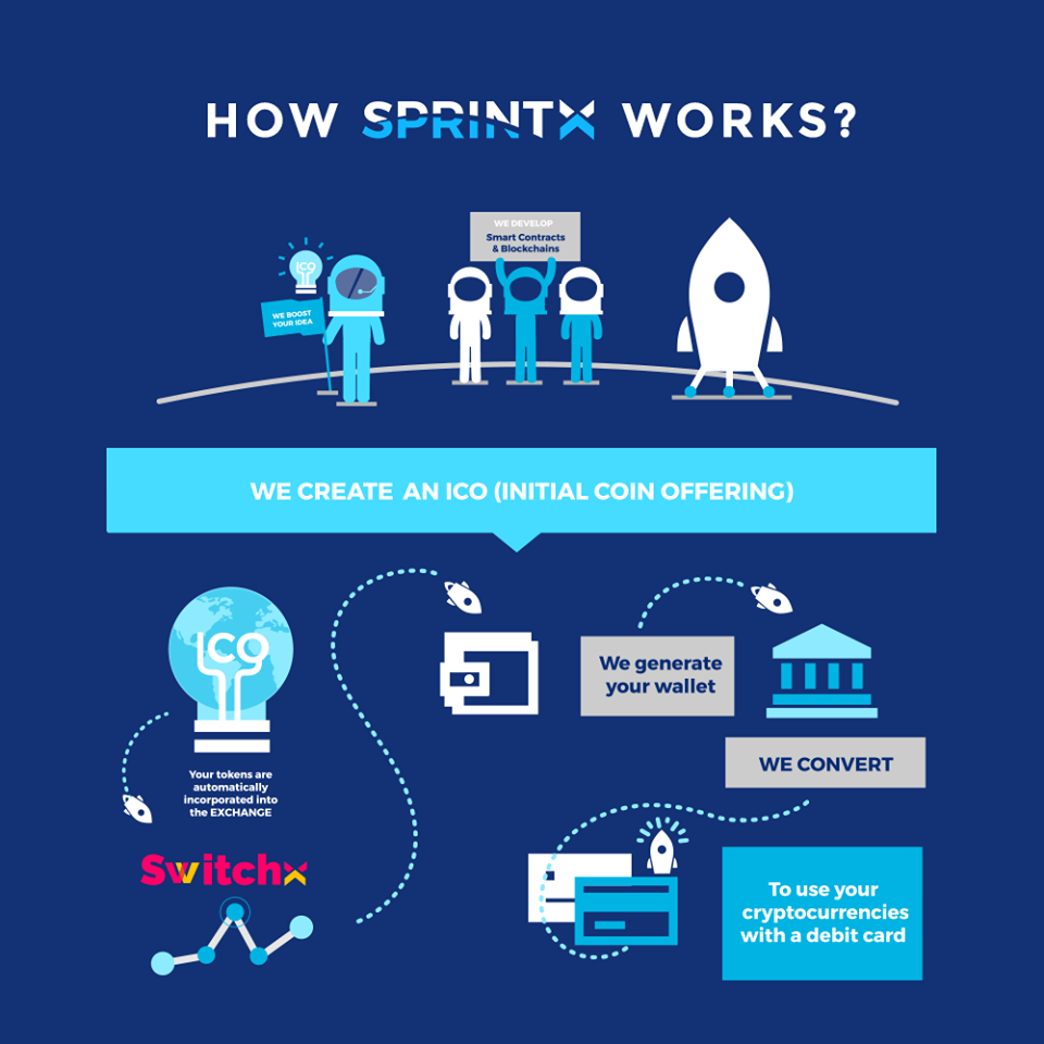 SprintX, SwitchX, dan NOVA bersama-sama menciptakan ekosistem untuk kepentingan bisnis, investor, dan startup. Mereka berkomunikasi dan bekerja dalam kombinasi untuk menciptakan platform yang unik dan efisien. SprintX memiliki beragam fitur seperti ICO Maker dan Smart Contract Generator. Bagian pertama dari proses ini adalah bahwa SprintX menganalisa dan mengevaluasi aplikasi yang mereka dapatkan dari berbagai startup untuk memutuskan apakah akan memulai dengan NOVA. Setelah itu, ia akan menyediakan ICO untuk startup setelah selesainya proses inkubasi, bersama dengan Kontrak Cerdas, Penasehat, Strategi Digital dan layanan ICO lainnya.