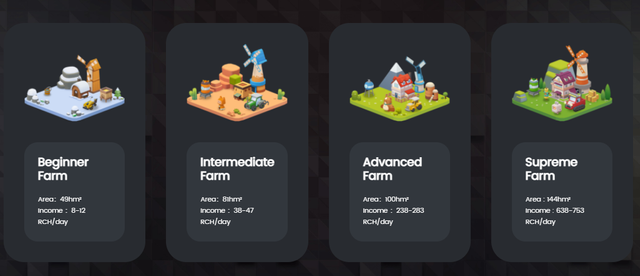 Ranch NFT: Ranch is a virtual token powered by blockchain technology (ERC-721 standard), which means that each farm is unique, non-exchangeable, rare and irreplaceable. They have landscapes and random components like houses, trees, wells attached to them. On MyRichFarm, farm owners can lease their farms to other players to generate RCH tokens for them or rent farms from other players to use for their own business and activities. The RCH token will be automatically paid to the farm owner when the farm is leased.